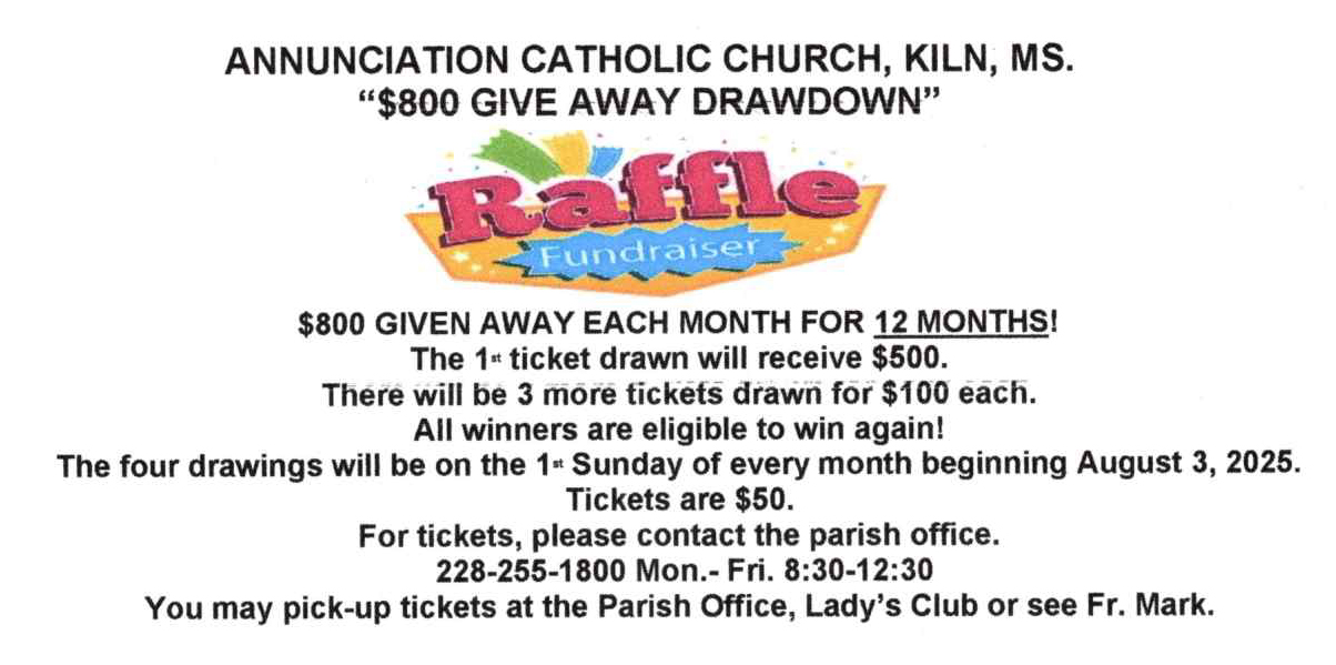 Aug 3 Annunication Catholic Church $800 Give Away Drawdown August 3, 2025 - August 6, 2025 Annunciation Parish Kiln Delisle Road, Kiln Event Details Get Directions